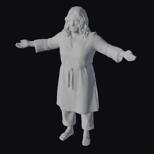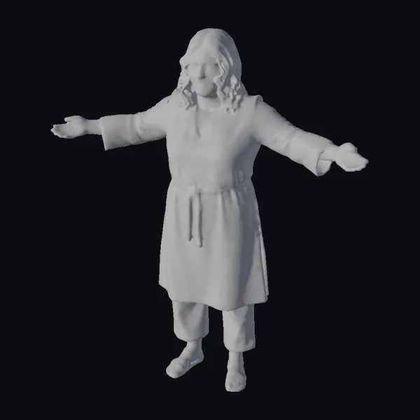 This meticulously crafted 3D model depicts a man clad in an olive green robe cinched at the waist with a matching belt, paired with sandals. His dark, shoulder-length hair frames his face as his arms are outstretched to the sides. The model’s realistic style brings to life a figure that could be a sage, philosopher, or a humble villager from ancient times. The olive tones of his attire are complemented by the simplicity of his footwear, grounding the character in historical authenticity. This model is perfect for projects requiring a character with a serene and contemplative demeanor, suitable for use in historical dramas, educational content, or animated stories.