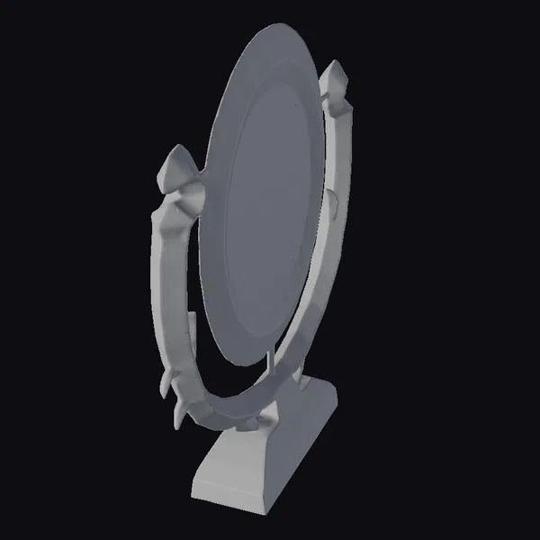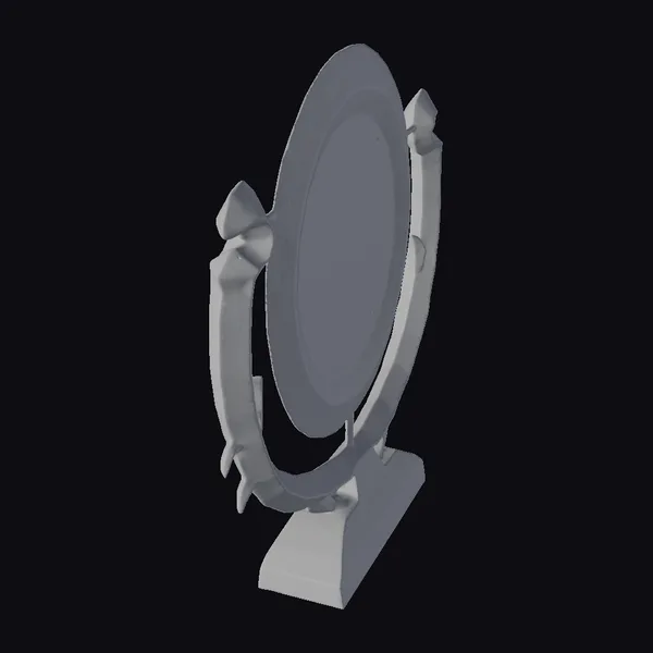 Positioned at an angle, the oval mirror appears to be floating, supported by a curved frame that seems to be twisted and shaped like a mythical creature. The frame’s golden details glisten against a backdrop of muted stone tones, casting a mystical glow. The base, sturdy and rectangular, grounds the piece. Ideal for games, animation, or VR/AR projects seeking an air of ancient mysticism, this model brings a touch of the arcane to any scene. Its intricate design and balanced proportions make it a versatile asset for various creative endeavors.