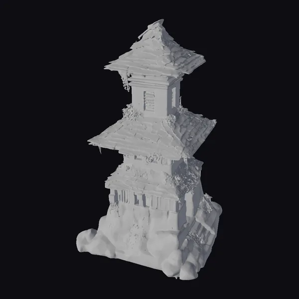 In a state of serene neglect, this ancient pagoda tower stands tall, its multi-tiered roofs a testament to meticulous craftsmanship. The structure’s weathered stone façade is generously adorned with moss and lichen, with verdant greenery sprouting from the crevices, infusing the air with an aura of mystique. The base of the tower appears to be a natural extension of the surrounding terrain, as if the earth itself had given rise to this architectural marvel. The shuttered windows and ornate eaves evoke a sense of secrets and stories hidden within. Ideal for projects requiring a touch of ancient mystique, this model is suited for use in games, 3D printing, VR/AR experiences, animation, and architectural design.