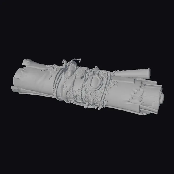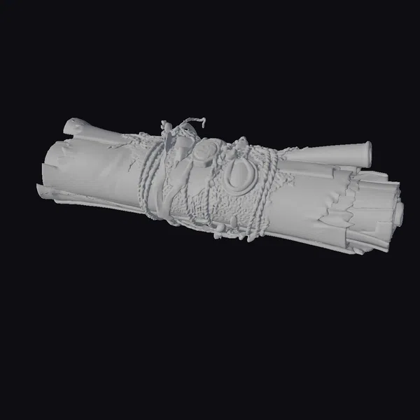 This exquisitely detailed ancient scroll model showcases a wealth of textures and features. The parchment’s surface exhibits subtle wear and tear, with minute creases and age-related damage. A central leather strap, cinched with sturdy rope, encircles the scroll, complete with a large, circular red seal that appears to be made of wax or a similar material. Two smaller seals are positioned above it, adding to the sense of authenticity. The scroll’s ends are uneven, with some areas curled and others frayed, lending to its aged appearance. When viewed from the side, the layers of parchment are visible, giving a sense of depth. This model is perfect for use in historical, fantasy, or mystery-themed projects, including games, animations, and architectural visualizations. Its intricate details make it an excellent choice for close-up shots or scenes where props are essential.
