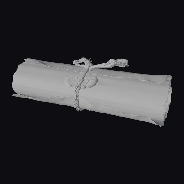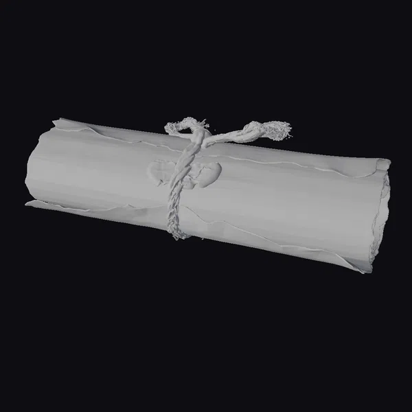Detailed to perfection, this ancient parchment scroll showcases a yellowed, aged paper texture with visibly worn edges, giving it a truly authentic look. The scroll is tightly rolled and secured with a sturdy green and red cord, intricately wrapped around its center. A distinctive red wax seal, partially melted and uneven, adds a touch of realism and importance to the document. The parchment features subtle, brown ink text and illustrations that seem to whisper tales of a bygone era. When illuminated, the scroll’s semi-transparent nature allows the faint glow of an inner light to emanate, suggesting its contents are meant to be revealed under careful consideration. Ideal for projects requiring an element of history, mystery, or fantasy, this model can enhance scenes in games, animations, VR/AR experiences, and architectural visualizations, offering a tangible connection to the past.