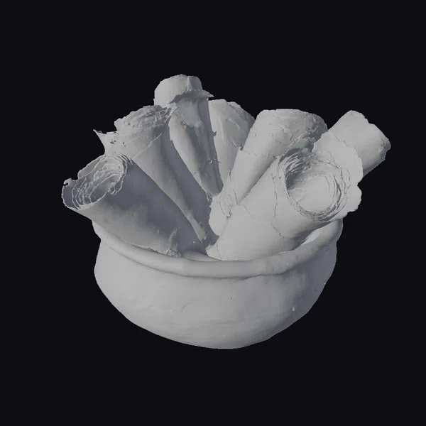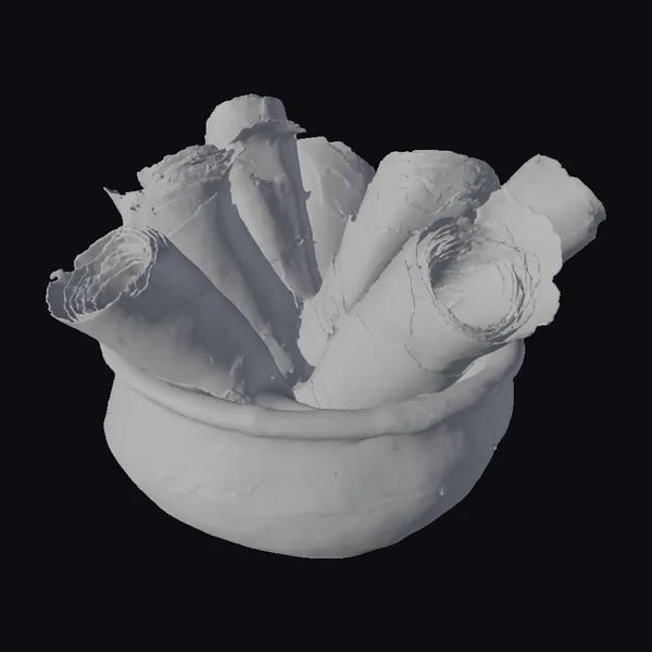 Nestled within a weathered bowl, a collection of parchment scrolls radiates an aura of mystique. Each scroll, meticulously detailed with cracks, creases, and frayed edges, appears to have been plucked straight from the annals of history. The bowl itself, with its subtle striations and earthy hue, complements the scrolls perfectly, grounding the composition in a sense of tactile realism. The arrangement suggests a moment frozen in time, as if the scrolls have just been carefully placed or are about to be unrolled. This setup is perfect for projects requiring an air of antiquity, such as historical animations, game environments, or architectural visualizations. The realistic textures and lighting make it suitable for high-end applications, including VR/AR experiences and detailed 3D renderings.