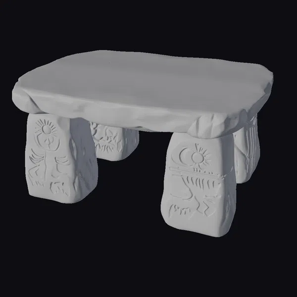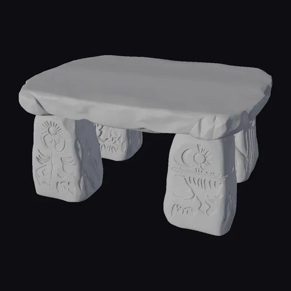 Crafted with meticulous attention to detail, this stylized table boasts a flat, irregularly shaped top that mimics the natural texture of stone, complete with subtle veining and a soft, muted color palette. The four legs, each uniquely carved with petroglyph-inspired designs, include depictions of suns, abstract humanoid figures, and animals, suggesting a rich narrative history. The table’s overall design combines earthy tones with an air of ancient mystery, making it a perfect centerpiece for themed interiors or as a distinctive prop in creative projects. Whether for games, 3D printing, VR/AR experiences, animation, or design, this model brings a touch of the primordial to any project.