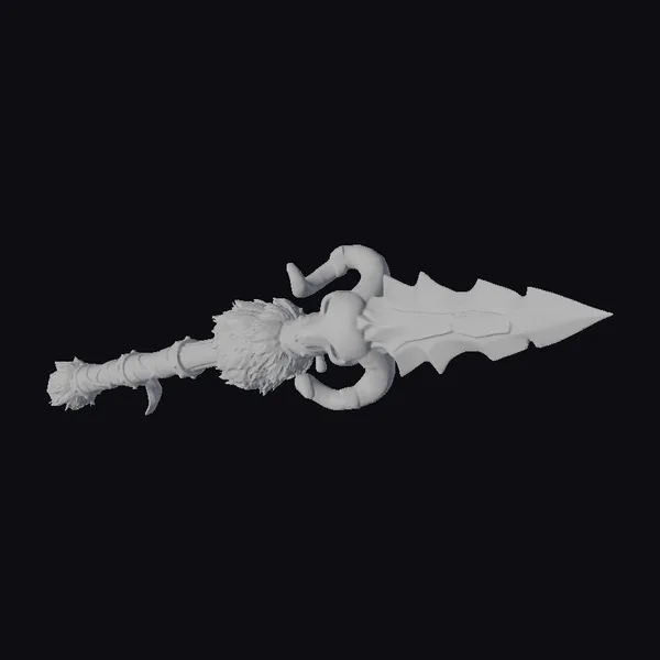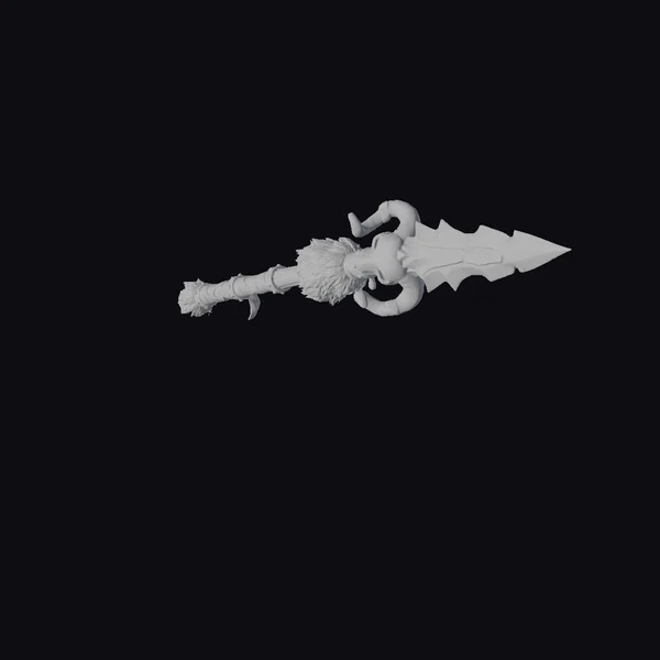 Crafted from a combination of bone, fur, and leather, this spear exudes an aura of ancient, tribal mystique. The blade, a stark white bone, is sharpened to a razor’s edge and notched for a fearsome appearance. Two curved ram horns protrude from the base of the blade, adding to the weapon’s imposing presence. The handle, wrapped in strips of fur and leather, provides a secure grip. The spear’s design speaks to a time when weapons were as much a statement of power as they were tools of survival. Ideal for projects seeking to evoke a sense of primal, mythical worlds, this spear can bring authenticity to games, animations, and designs aiming for a deep historical or fantastical feel.