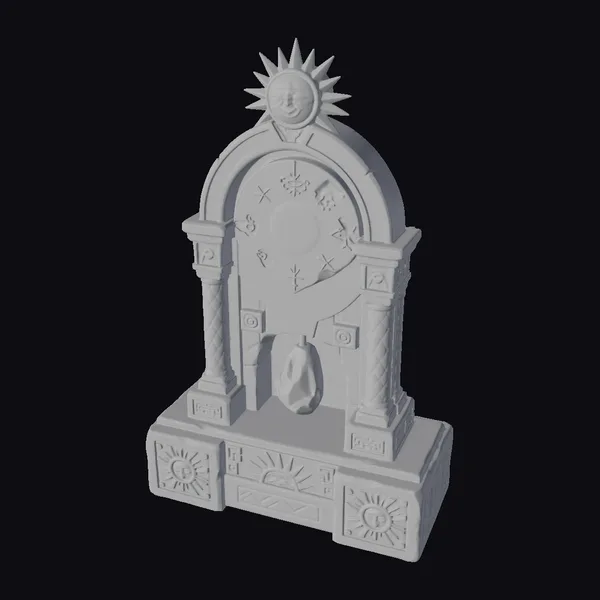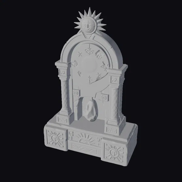 This ancient ritual time marker presents a captivating blend of natural materials and mystical symbolism. The pose showcases the structure’s imposing presence, with the stone base providing a sturdy foundation for the intricately carved wooden elements. The textures of weathered stone and worn wood invite the viewer to explore the details, from the golden sunburst at the apex to the soft, ethereal flame dancing within the arched opening. The lighting accentuates the geometric patterns etched into the stone, casting a warm glow that highlights the model’s proportions and unique features. As a 3D model, it lends itself to various applications, including game environments, architectural visualizations, VR/AR experiences, animations, and design projects seeking to infuse a sense of ancient mysticism.