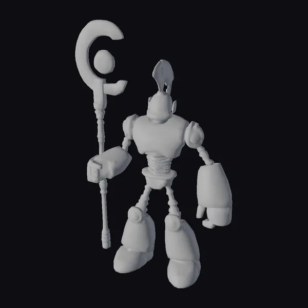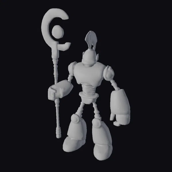 This ancient robot guardian is meticulously detailed, with a teal and gold color scheme that suggests a blend of technology and mysticism. The robot stands in a powerful pose, with its curved staff at the ready. The ornate designs on its body and staff indicate a rich history, while its overall appearance conveys a sense of protection and guardianship. The model’s stylized features make it suitable for a variety of applications, including games, animation, and design projects. Its unique blend of sci-fi and fantasy elements can add a distinctive touch to any project.