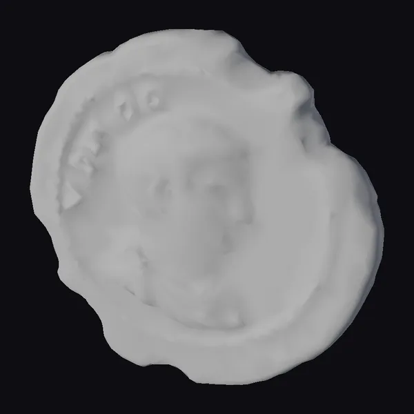 This meticulously crafted 3D model of an ancient Roman coin presents a captivating visage, with the profile of a bygone leader embossed in remarkable detail. The short, curly hair and beard of the depicted individual are accentuated by the subtle play of light on the metallic surface, which gradates from warm gold to deep green hues, suggesting an aged patina. The coin’s edge is irregular and wavy, adding to its antique charm. Inscriptions encircle the portrait, rendered in precise relief. This model is perfect for use in historical reconstructions, educational materials, or as a detailed prop in film and game projects seeking an air of authenticity.