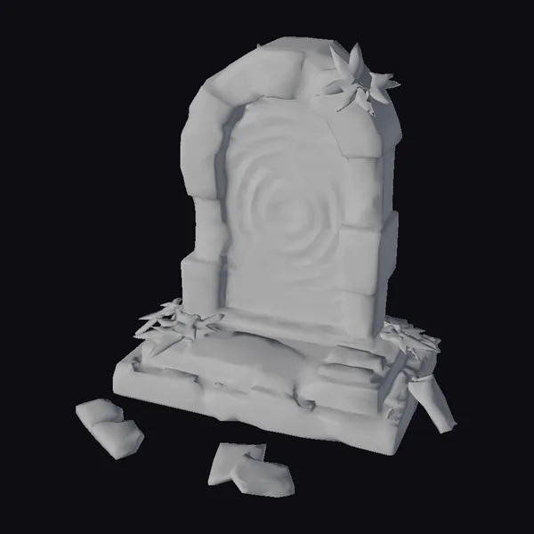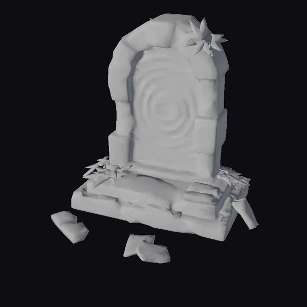 Perched atop a crumbling stone base, the archway stands as a testament to a long-forgotten civilization. The white stone is weathered and worn, with visible cracks and crevices, while the glowing blue portal within seems to pulse with an otherworldly energy. Lush green leaves sprout from the structure, as if nature is attempting to reclaim it. The scattered debris at the base adds a sense of drama and history to the scene. This 3D model would be perfect for use in games, animations, or architectural visualizations, transporting viewers to a world of fantasy and adventure.