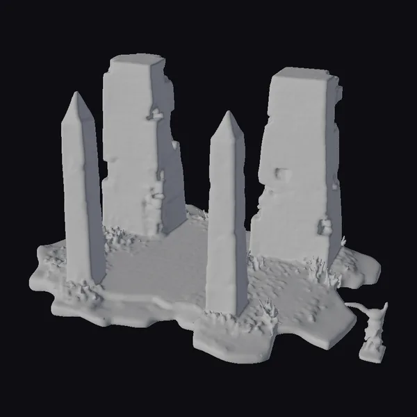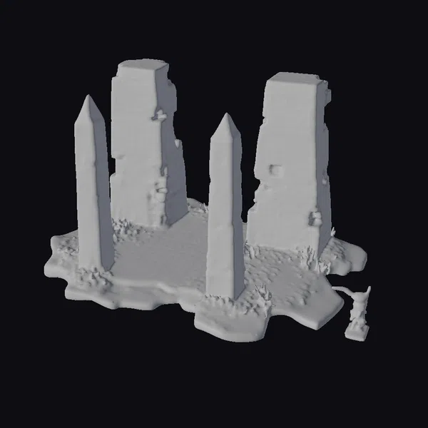 Crafted with meticulous attention to detail, this diorama presents a captivating scene of ancient ruins. Four imposing stone pillars, adorned with intricate carvings, flank the entrance to a temple. The structures, with their weathered textures and earthy tones, appear as if they have been reclaimed by the desert sands. A small, detailed pathway leads to the heart of the ruins, inviting adventurers to explore the mysteries within. The model is perfect for game developers, filmmakers, and architects seeking to add a touch of history and mystique to their projects. Its realistic style and intricate details make it an excellent choice for 3D printing, animation, and virtual reality applications.