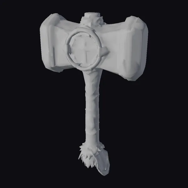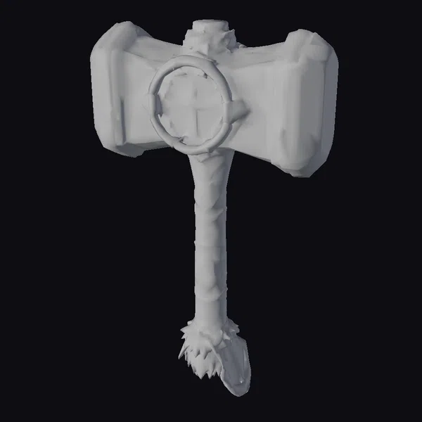 Detailed with precision, the hammer’s head boasts a striking yellow cross within a circular metal plate, surrounded by ornate golden runes that dance across its gray stone surface. The sturdy brown handle, wrapped in fur and adorned with additional runic symbols, exudes a sense of ancient craftsmanship. Perfect for games, animations, or designs seeking a touch of mythical strength, this model brings the essence of legendary weaponry to your projects.