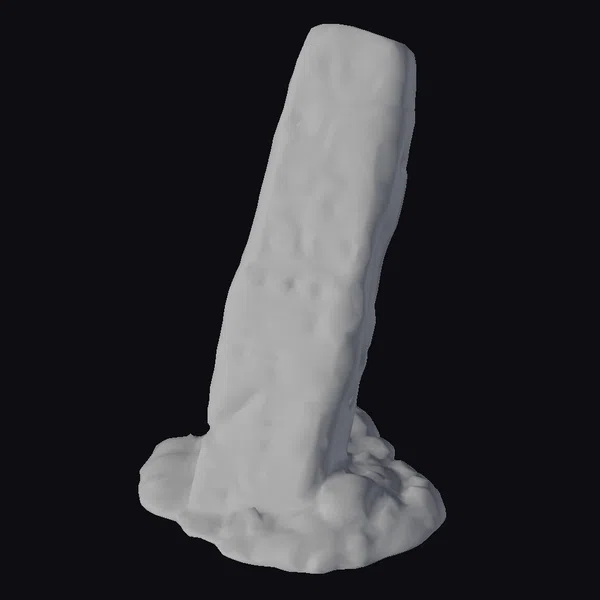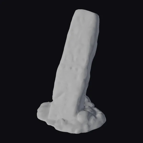 Positioned at a slight angle, the menhir boasts a rugged, natural texture with a predominantly gray color palette, accented by hints of green from the moss. The runes, etched deeply into its surface, suggest a rich history. The base, composed of smaller rocks and moss, adds to the antiquity and mystique of the monument. This 3D model is perfect for adding a touch of ancient mystery to games, animations, or architectural designs. Its detailed texture and realistic appearance make it suitable for high-quality renderings and immersive VR/AR experiences.