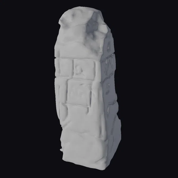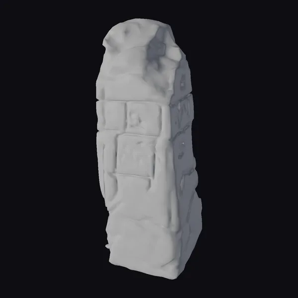Positioned in a subtle, dynamic pose, this menhir showcases a detailed, block-like structure with each section meticulously carved with ancient runes. The texture of the stone is rough and weathered, with hints of green moss growing at the base, suggesting age and exposure to the elements. The runes, etched into the stone blocks, vary in design, adding to the mystique and historical significance of the monument. The lighting accentuates the depth of the carvings and the ruggedness of the stone, highlighting the craftsmanship and detail. Ideal for use in historical, fantasy, or educational projects, this model can enhance scenes in games, animations, or virtual reality experiences, providing an authentic touch to any setting.