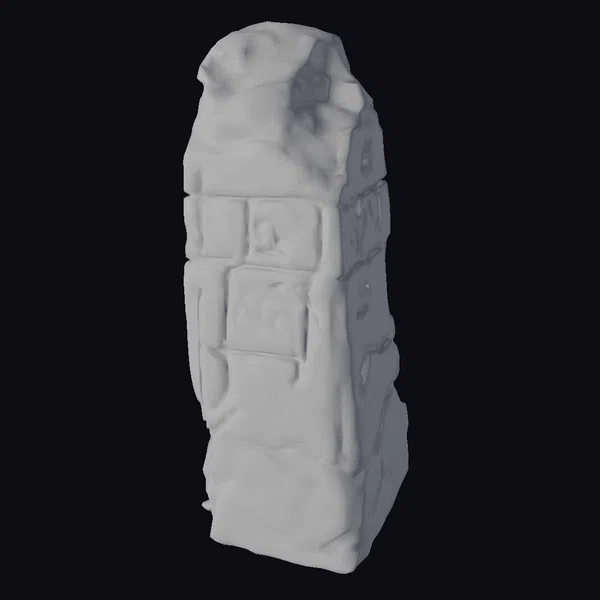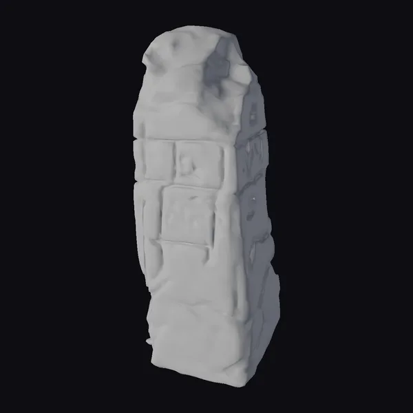 Positioned in a subtle, dynamic pose, this menhir showcases a detailed, block-like structure with each section meticulously carved with ancient runes. The texture of the stone is rough and weathered, with hints of green moss growing in the crevices, adding to its aged appearance. The runes, etched into the surface, seem to hold secrets of the past, inviting the viewer to ponder their meaning. The lighting highlights the rugged texture and the intricate carvings, bringing out the depth and complexity of the monument. This 3D model would be perfect for projects requiring a touch of ancient mystery, such as historical animations, game environments, or architectural designs looking for a unique, historical element.