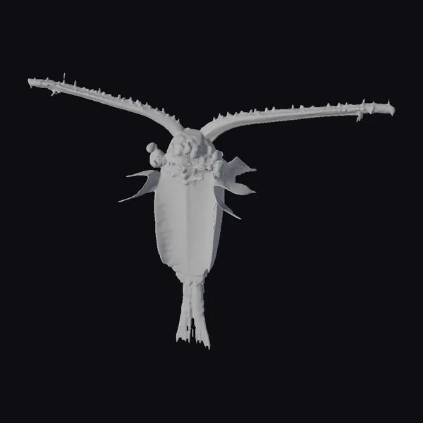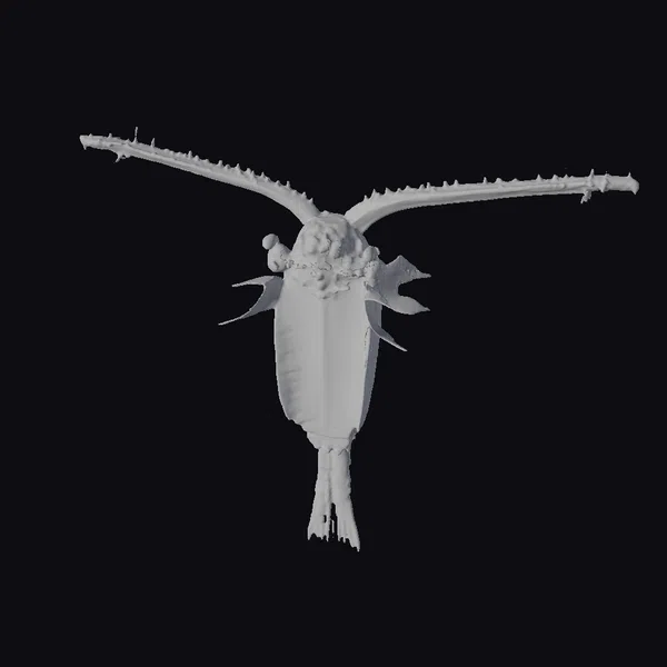 This meticulously crafted 3D model of an ancient sea creature fossil presents a mesmerizing sight. The creature’s elongated body, covered in a grid-like pattern of lighter and darker shades of brown, gives a sense of depth and texture. Two long, spiny protrusions extend from its head, evoking a sense of ancient, alien-like features. The bulbous head, with its orange and yellow hues, seems to glow with an ethereal light, while the jagged limbs add to the creature’s menacing appearance. The model is perfect for use in games, 3D printing, VR/AR experiences, animation, and design projects, offering a unique and captivating element to enhance your creations.