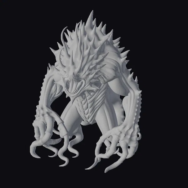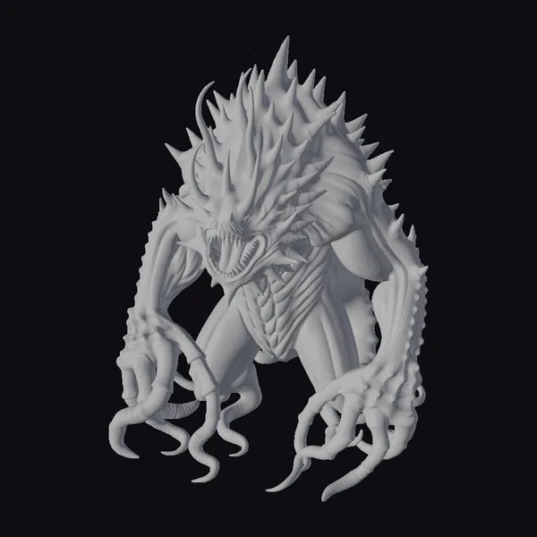 Perched in a menacing stance, the ancient sea god monster towers over its surroundings, exuding an aura of primal fear. Its body is a mass of dark green, scaly flesh, with powerful muscles rippling beneath the surface. A distinctive array of spikes runs along its back, culminating in a sharp, pointed crown that adds to its already formidable presence. The creature’s mouth is a cavernous maw filled with razor-sharp teeth, glowing with an eerie orange light. Long, slender tentacles end in sharp claws, perfect for snatching and holding onto prey. The texture of its skin appears slick and wet, as if freshly emerged from the depths. This model is perfect for use in games, animation, or 3D printing, offering a chilling addition to any underwater or fantasy scene.