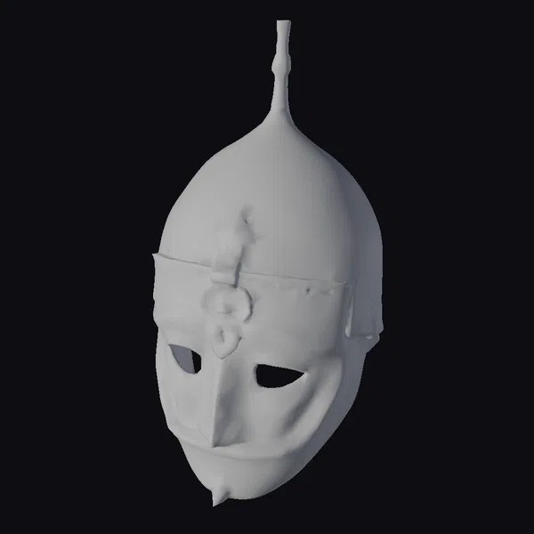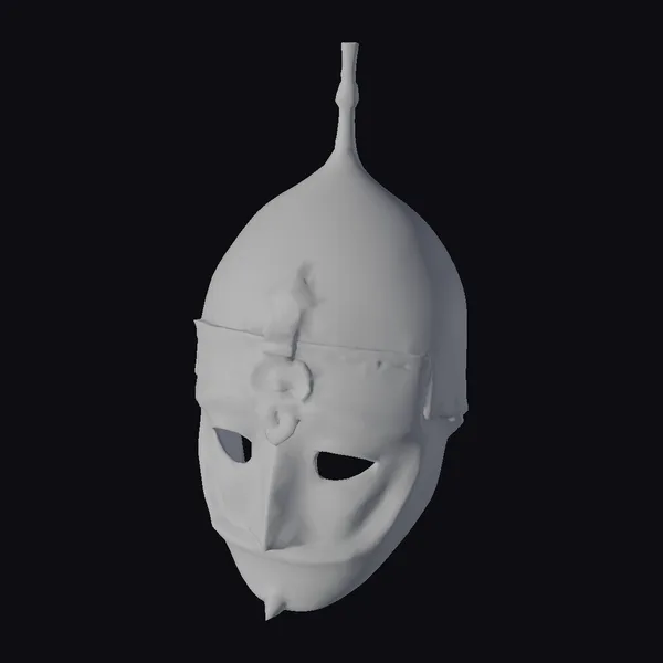 Crafted with meticulous attention to detail, this ancient silver helmet showcases a pointed top and a nose guard that adds to its imposing presence. The eye holes and mouth slit give it a mysterious aura, while the metallic texture and subtle reflections on its surface bring a sense of realism. The helmet’s design, complete with a decorative band across the forehead, speaks to its historical significance. Ideal for use in historical dramas, video games, or virtual reality experiences, this model can transport viewers to a bygone era. Its high level of detail makes it suitable for close-up shots or as part of a larger scene.