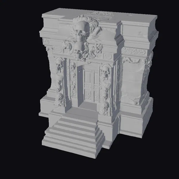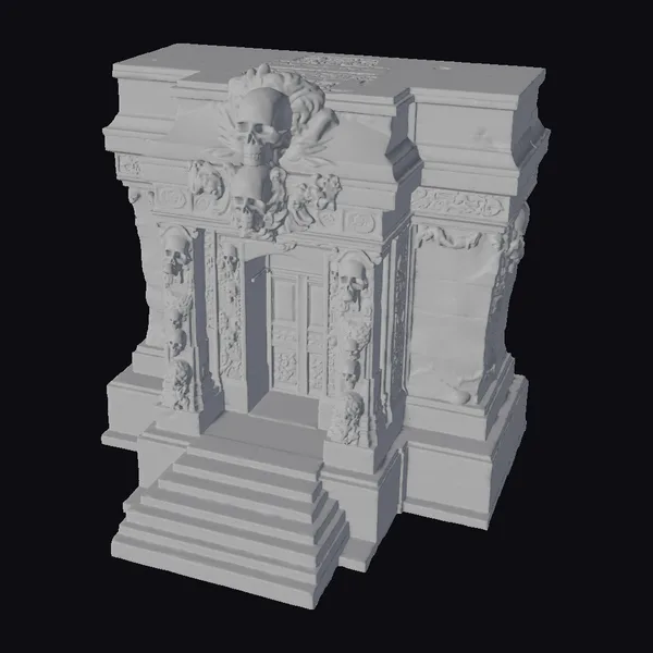 Perched atop a short staircase, the entrance is flanked by imposing stone pillars, each embellished with skulls that seem to watch passersby with cold, empty eyes. The central archway, crowned with a trio of larger skulls surrounded by a halo of stone and moss, frames a dark wooden door that appears as if it hasn’t been opened in centuries. The structure’s gray stone blocks, bearing the scars of time and weather, contribute to the overall haunting ambiance. This model is perfect for projects requiring a touch of dark fantasy, such as games, animations, or architectural designs seeking a haunted, mystical feel.