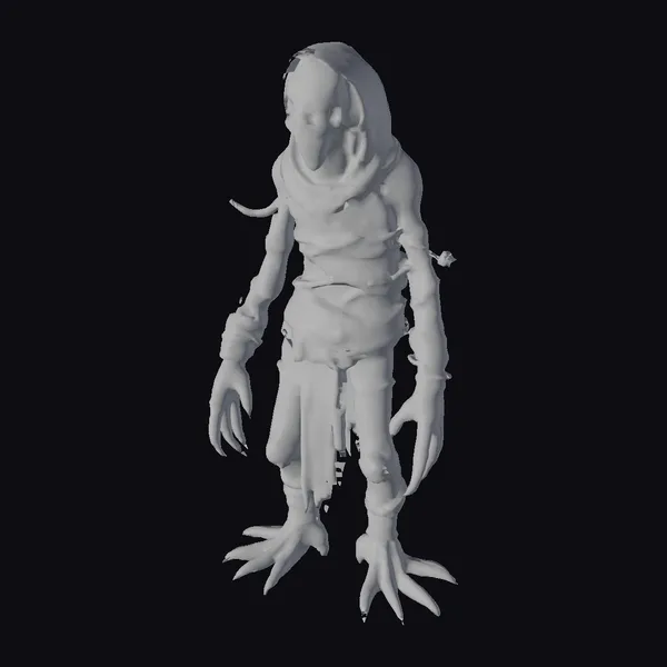 Standing with a twisted, menacing posture, this creature’s undead body is a testament to ancient, extraterrestrial craftsmanship. The metallic, alien bindings that wrap around its mummy-like form glisten with a faint, eerie sheen, as if infused with an otherworldly energy. The creature’s face, a haunting blend of skull and skeletal features, is topped with glowing red eyes that seem to pierce through the darkness. Its zombie-inspired limbs, tipped with razor-sharp claws, appear ready to strike at any moment. This model is perfect for adding a touch of cosmic horror to games, animations, or any project requiring a unique, terrifying character.