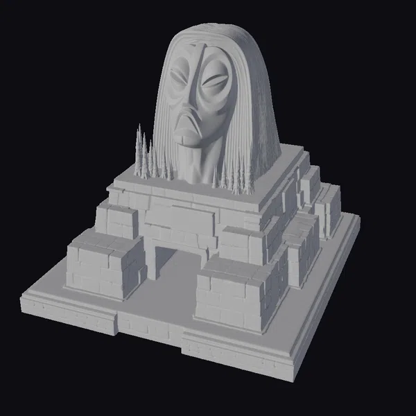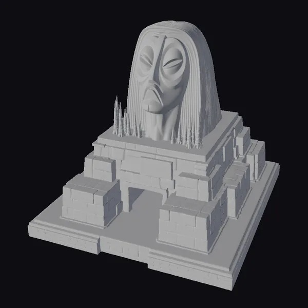 Gaze upon the majestic, stylized sphinx head that crowns this ancient temple, its tranquil expression a poignant juxtaposition to the worn, beige-colored bricks that form the structure’s base. The sphinx’s flowing locks cascade down its face, while its closed eyes exude an air of mystique. The temple’s entrance, a dark and inviting void, is nestled between two smaller, stepped platforms. White, spire-like protrusions punctuate the dark surface atop the temple, adding an air of enigma. This 3D model is perfect for use in games, 3D printing, VR/AR experiences, animation, and design projects, offering a rich, immersive environment for creative exploration.