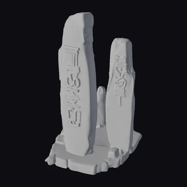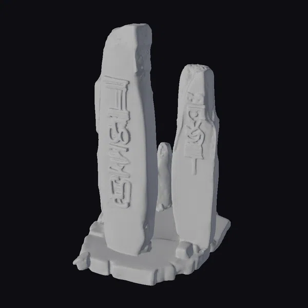 Positioned dynamically, the two central stones rise from a circular stone base, their surfaces weathered and covered in moss, suggesting ages of exposure to the elements. The stones themselves are adorned with ancient symbols, etched into the surface with a precision that belies their rugged appearance. The lighting highlights the textures of the stone and the intricate carvings, suggesting a setting that could be within a dense, mystical forest or a forgotten ruin. The monument’s design invites imagination, perfect for projects requiring an air of mystery and ancient wisdom. Ideal for use in games, 3D printing, VR/AR experiences, animations, or architectural designs that seek to evoke a sense of history and mystique.