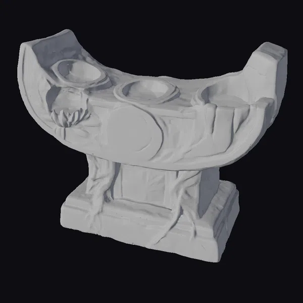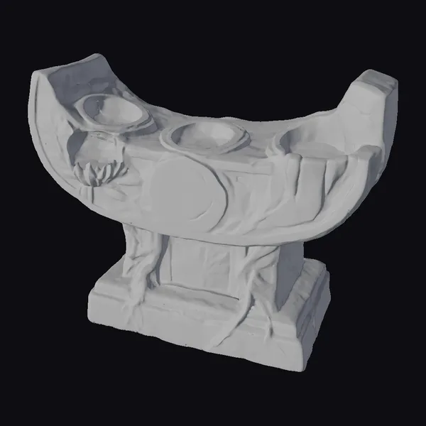 Crafted with meticulous detail, this ancient stone altar boasts a curved top with three circular depressions, adorned with ornate carvings of leaves and flowers. The weathered stone surface exhibits a soft, mossy texture, adding to its aged appearance. The base of the altar features additional carvings, completing its authentic look. Ideal for use in games, 3D printing, VR/AR experiences, and animation projects, this model brings an air of mystery and history to any scene.