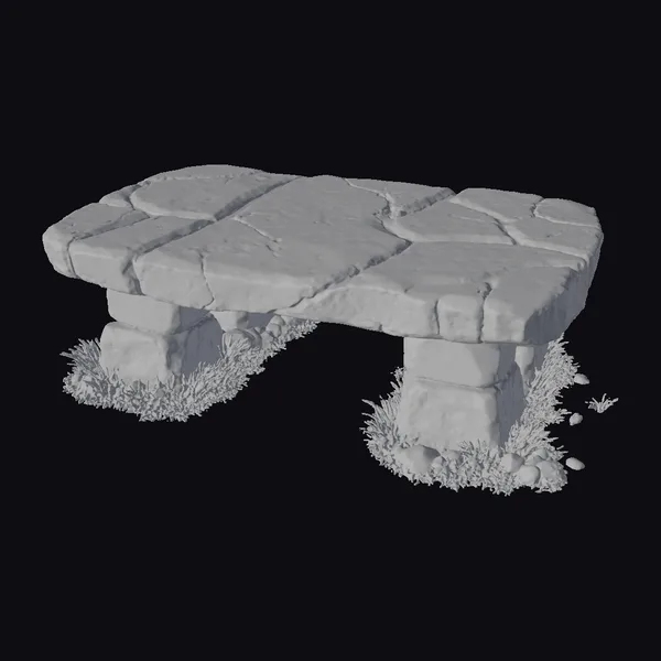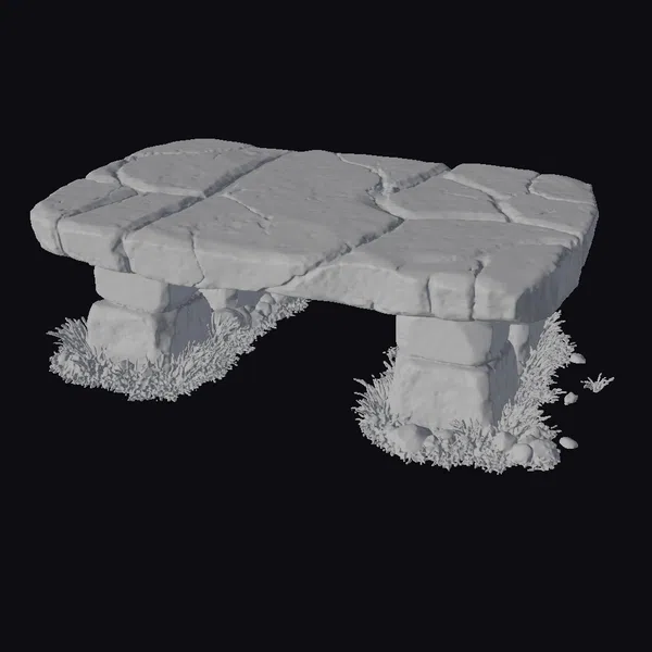 Positioned in a majestic pose, this ancient stone altar exudes an aura of mystique and power. The structure is composed of several large, irregularly shaped stones stacked to form a flat top and two supporting pillars. The surface of the altar features a network of deep cracks, each glowing with a soft, blue luminescence that suggests an ancient, mystical energy. The base of the altar is surrounded by tufts of green grass and small rocks, grounding the structure in a natural setting. The texture of the stones is rough and weathered, with visible signs of aging and wear. The blue glow emanating from the cracks adds a dynamic, almost surreal quality to the model. This level of detail makes the altar perfect for use in games, 3D printing, VR/AR experiences, animation, and design projects where a touch of fantasy and mystery is desired.
