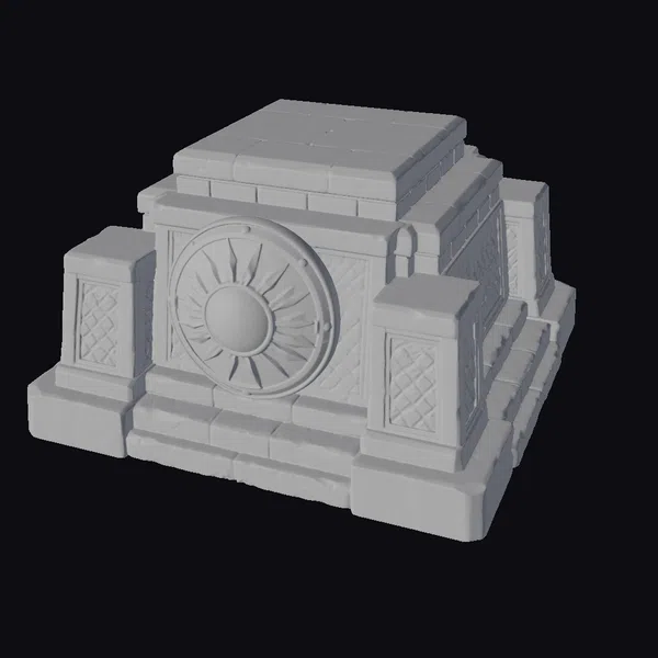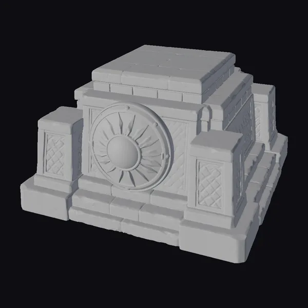 Perched atop a square base, the Ancient Stone Altar Base rises in tiers, culminating in a flat, weathered stone surface. The front face boasts an impressive golden sun symbol, radiating from a central sphere. Ornate details dance across the surface, including diamond-patterned etchings on the side pillars. As a versatile 3D model, it can be used in various applications, such as game environments, architectural visualizations, or 3D printing projects. The model’s intricate design and textures evoke a sense of history and mysticism, perfect for adding depth to fantasy or ancient settings.