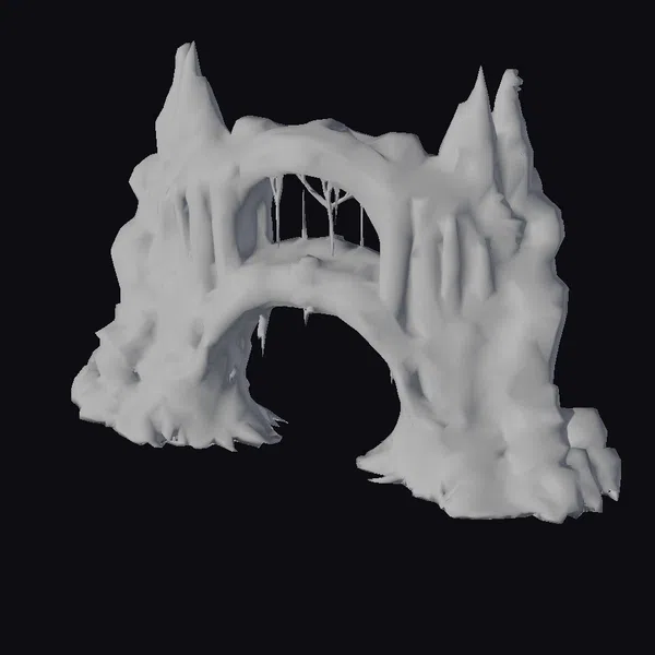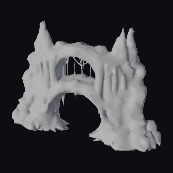 Positioned dramatically against a stark white backdrop, the ancient stone archway commands attention with its imposing presence. The structure’s base appears to be crafted from rough-hewn stones, gradually morphing into a smoother, more refined surface as it ascends. A lush carpet of moss covers sections of the arch, infusing the gray stone with a burst of life. Icicles hang from the top, adding a touch of fragility to the otherwise robust design. The archway’s opening beckons like a gateway to another realm, inviting onlookers to step into the unknown. Its detailed textures and realistic rendering make it an ideal asset for projects requiring a touch of ancient mystique, such as games, animations, or architectural visualizations.
