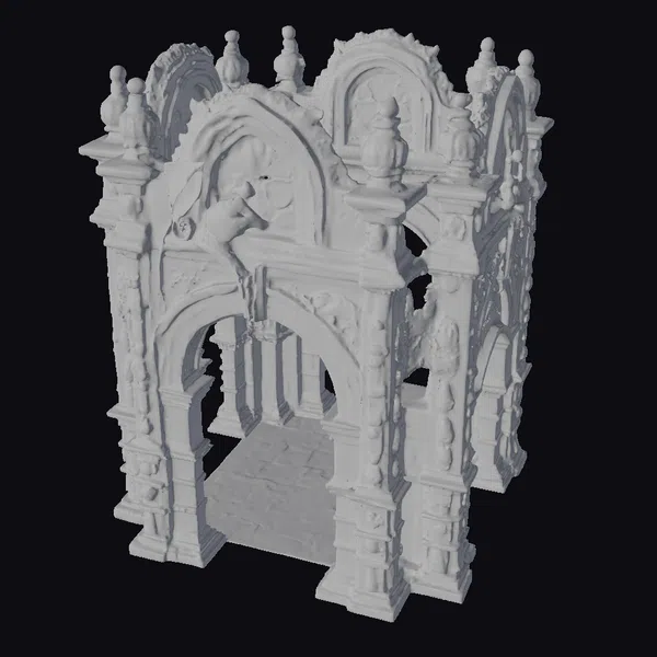 Deep within the heart of a mystical realm, an ancient stone archway stands as a testament to a bygone era. This exquisitely detailed model features a dragon perched atop its highest point, gazing out over the surrounding landscape. The archway itself is adorned with intricate carvings and ornate details, while vibrant stained glass windows filter in shafts of colorful light. As the dragon’s tail cascades down the side of the structure, the overall effect is one of enchantment and awe. Ideal for use in games, animation, or 3D printing, this model is sure to transport your audience to a world of wonder.