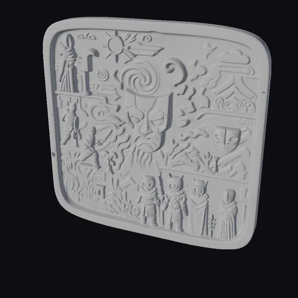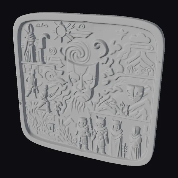 This stunning stone carving is a masterful blend of artistry and storytelling. The central figure, with its swirling hair and glowing red eyes, commands attention amidst a tapestry of scenes showcasing ancient mythology. From the top left corner, where a figure stands before a sun symbol, to the bottom right, where robed figures gather, every detail is meticulously crafted. The carving’s weathered appearance, complete with green patina and stone texture, lends an air of authenticity. This 3D model is perfect for use in games, animations, or architectural visualizations where a touch of ancient mystique is desired.