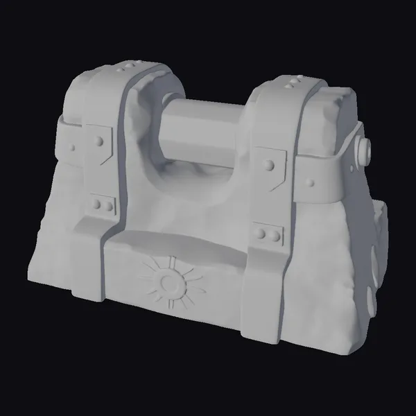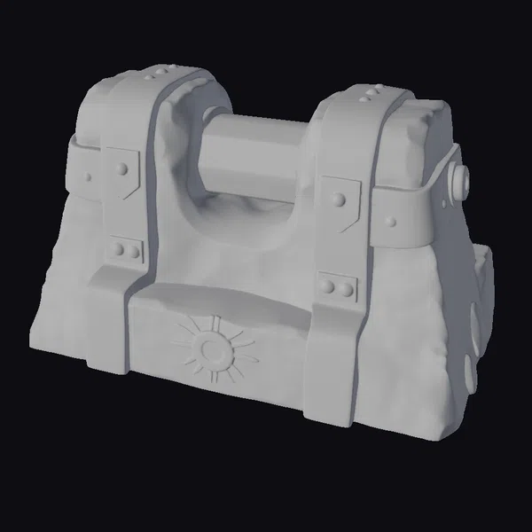 Perched on a sturdy base, the Ancient Stone Catapult stands proudly, its stone body a mesh of cracks and moss, telling tales of ages past. The metal components, adorned with rivets, showcase a blend of functionality and craftsmanship. A cylindrical core dominates the center, flanked by metal bands that secure it firmly in place. The etched sun symbol on the front adds an air of mystery, suggesting a deeper narrative behind its creation. Ideal for use in historical or fantasy settings, this model brings a touch of authenticity to games, animations, or architectural designs seeking to evoke a sense of antiquity and strength.