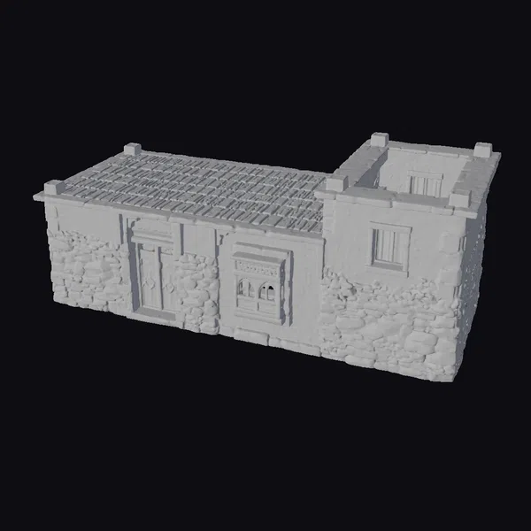 Positioned at a slight angle, the ancient stone cottage invites the viewer into its rustic world. The structure’s base is a sturdy mosaic of stones in shades of brown, tan, and gray, supporting walls that seem to have been plucked straight from a medieval landscape. A brown wooden door, adorned with a simple yet elegant design, serves as the focal point on the front facade. Two windows, one larger than the other, offer glimpses into the interior, their frames also made of weathered wood. The roof, a patchwork of darker, aged tiles, covers most of the structure, except for a section that appears to have been removed, revealing an open space within. This 3D model of an ancient stone cottage is perfect for projects requiring a touch of rustic fantasy, such as game environments, animations, or architectural designs. Its detailed textures and realistic proportions make it a versatile asset for creators looking to add a sense of history and place to their work.