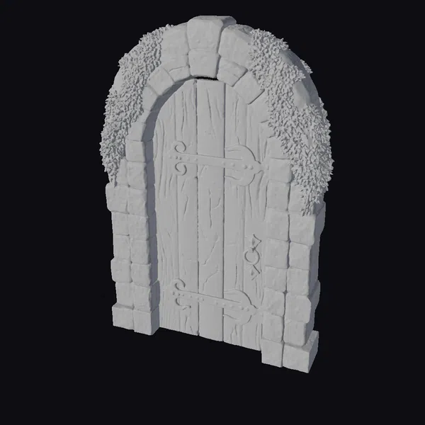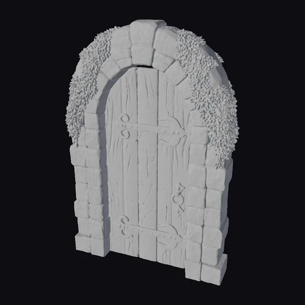 Perched atop a foundation of uneven stones, the arched doorway presents a formidable yet intriguing facade. The wooden door, composed of thick planks, is reinforced with two metal bands and features a substantial ring handle. The stones, weathered to a soft gray, are covered in patches of vibrant green moss and lichen, suggesting years of exposure to the elements. The doorway’s rustic charm and air of abandonment evoke a sense of curiosity. Ideal for use in games, 3D printing, VR/AR experiences, animation, and design projects seeking an ancient, mystical ambiance.