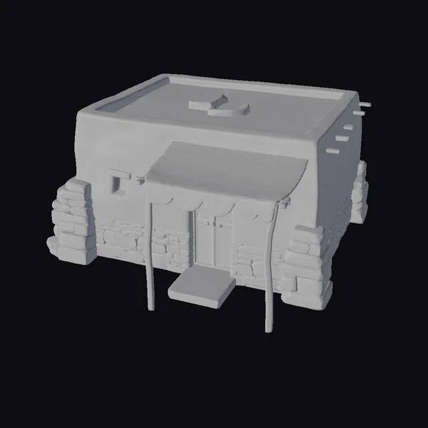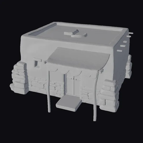Nestled within a serene setting, the ancient stone dwelling presents itself with a charming facade. Its base is skillfully crafted from stacked stones, varying in size and texture, providing a sturdy foundation. The walls, made of adobe, exude a warm, earthy glow, complemented by a flat roof where a couple of objects are casually placed, adding to the dwelling’s rustic charm. A notable feature is the brown awning above the entrance, supported by two slender poles, which adds a touch of warmth and invitation. A small, square window on the side offers a glimpse into the interior. The combination of natural materials and simple design elements evokes a sense of timelessness and tranquility. This model is perfect for projects requiring a touch of rustic or ancient architecture, suitable for use in games, 3D printing, VR/AR experiences, animations, and architectural designs.