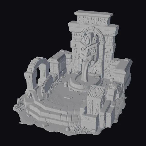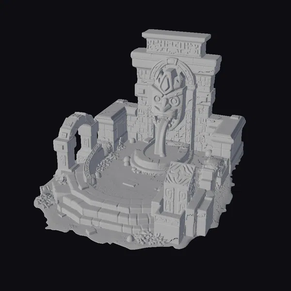 Perched atop a raised platform, the Stone Face Fountain commands attention with its imposing presence. The face, adorned with a green gemstone, appears to stare into the distance, its eyes aglow with an ethereal light. Water cascades from its mouth, creating a soothing melody that seems to echo through the air. The structure itself is a marvel of ancient engineering, with moss-covered stones and intricate carvings that tell tales of a long-forgotten civilization. As a 3D model, this fountain is perfect for adding a touch of fantasy to games, animations, or architectural designs. Its unique blend of mysticism and ancient architecture makes it an ideal centerpiece for any project seeking to transport viewers to a world of wonder.