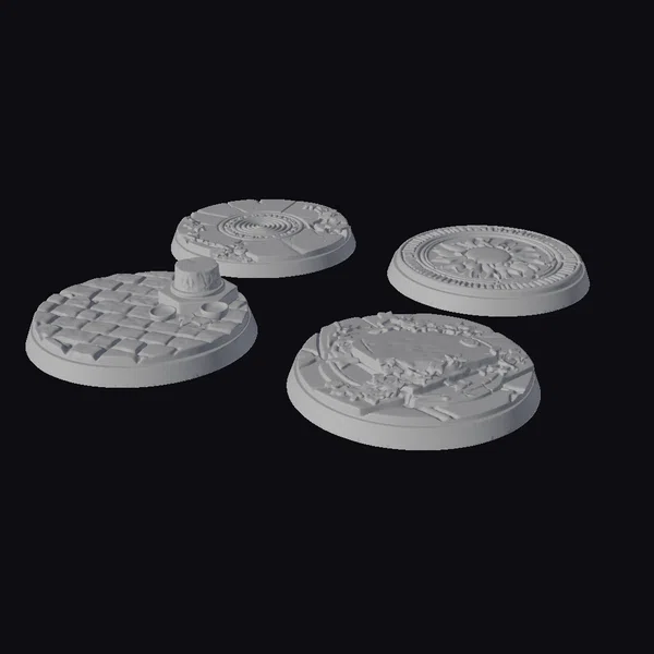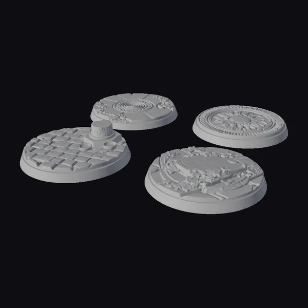 Rendered in exquisite detail, these four pedestals are presented in various states of disrepair, each one telling a story of its own. The top-left pedestal features a worn cobblestone design with a central cylindrical object, while the top-right boasts an elaborate gold sunburst pattern encircled by red and white details. The bottom-left pedestal showcases a flat stone surface surrounded by a wreath of green leaves, and the bottom-right features a similar leafy arrangement with a central stone slab. Crafted with precision, these models are perfect for adding a touch of ancient history to games, 3D printing projects, VR/AR experiences, animations, or architectural designs.