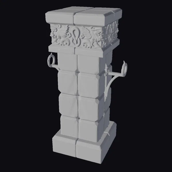 Crafted from a stack of square gray stone blocks, this low-poly pillar exudes a sense of aged grandeur. The base and shaft are covered in green moss and lichen, suggesting years of exposure to the elements. A beautifully rendered capital crowns the pillar, boasting intricate carvings of leaves and scrollwork. Two metal brackets protrude from the sides, hinting at a long-forgotten purpose. This versatile asset is perfect for game developers, architects, and designers seeking to add a touch of medieval mystique to their projects. Its low-poly aesthetic ensures seamless integration into a variety of 3D environments, from fantasy realms to historical reconstructions.