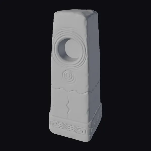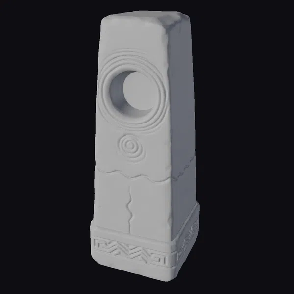 Standing tall with its rectangular base and slightly tapered top, this ancient stone pillar is adorned with a variety of carved symbols and patterns. The surface exhibits signs of aging, with cracks and weathering that suggest it has stood for centuries. A prominent circular opening on one side adds to its mystique, inviting speculation about its original purpose. The pillar’s base features a decorative border, adding to its ornate appearance. This model is perfect for use in games, 3D printing, VR/AR experiences, animation, and architectural design projects, particularly those with a fantasy or historical setting.