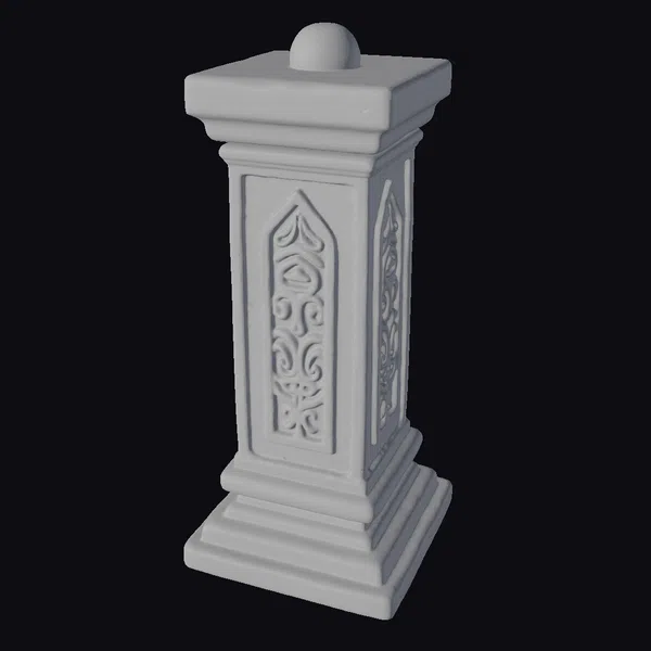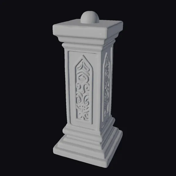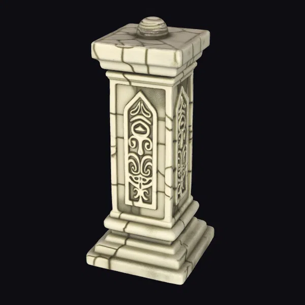 Standing tall with its square base and top, this intricately designed pillar features ornate carvings on its sides, showcasing a blend of historical and architectural beauty. The weathered stone texture and cracked surface add to its antique charm, suggesting years of exposure to the elements. The pillar’s design is characterized by a series of stacked rectangular blocks, forming its base, shaft, and capital, culminating in a small, rounded finial at the top. The carvings, likely inspired by Gothic or Romanesque styles, add a layer of sophistication and cultural depth. This model is ideal for use in historical reconstructions, architectural visualizations, games, and animations where an element of antiquity is desired. Its detailed and realistic appearance makes it suitable for close-up shots or as part of a larger scene.