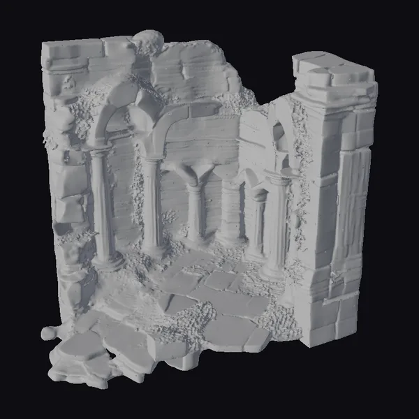 Perched precariously, moss and ivy drape across the weathered grey blocks, infusing the ancient stone ruin with a sense of mystique. Fractured columns stand sentinel, their surfaces etched with the patina of time. The structure’s core, with its intricate arches and worn stone floor, beckons the imagination to fill in the tales of a bygone era. Ideal for games, 3D printing, VR/AR experiences, animation, and design projects seeking to evoke a sense of history and mystery.