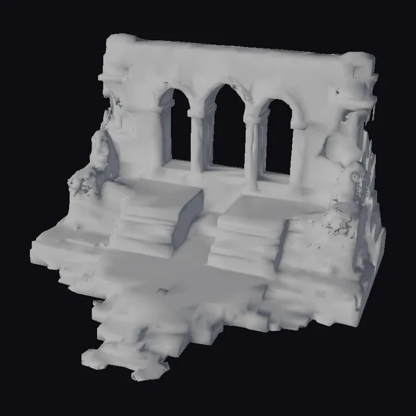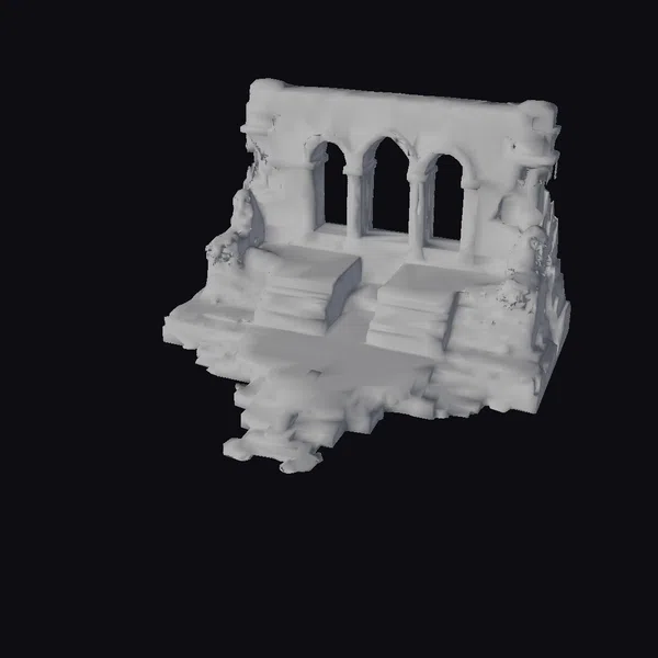 Perched atop a weathered stone base, a majestic ancient ruin rises, its gray stone façade softened by vibrant green moss and lichen. Three rounded arches stand sentinel, while steps lead up to a central platform, flanked by smaller structures and warmly glowing windows. As nature reclaims this once-grand building, the air thickens with an aura of forgotten history. Ideal for adding a touch of mystique to games, 3D environments, or architectural designs, this model invites exploration and storytelling.