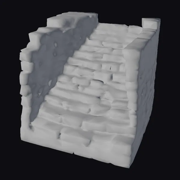 Perched at an angle, this ancient stone staircase invites you to explore its worn, weathered beauty. The staircase’s wide, shallow steps are crafted from rough-hewn gray stone, with visible cracks and uneven surfaces that tell tales of centuries past. Patches of bright green moss add a touch of life to the ancient structure, growing in the crevices and cracks. The staircase is flanked by low walls on either side, with the left wall featuring a more intact structure and the right wall appearing more ruined. As light dances across the staircase, it highlights the intricate textures and details, from the rough stone to the soft moss. This model is perfect for adding a touch of history and mystery to games, animations, or architectural designs.