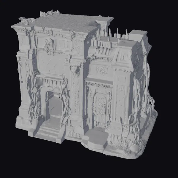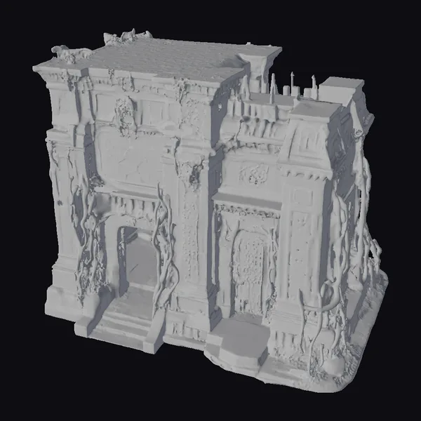 Perched precariously, with walls covered in thick, green moss and tendrils of vines snaking up its surfaces, this ancient stone temple exudes an aura of neglect and mystique. The rectangular building features a flat roof, adorned with more moss and what appears to be the remnants of small spires or pinnacles. The facade is rich with detailed reliefs, depicting scenes that seem to tell a story of a long-forgotten civilization. A large, ominous doorway beckons, flanked by columns that add to the structure’s sense of grandeur and decay. The intricate textures and the play of light and shadow on the model’s surface bring to life a scene that could easily be a set piece from a dark fantasy tale. Ideal for use in games, 3D printing, VR/AR experiences, animation, and design projects seeking to evoke a sense of ancient mystery and horror.
