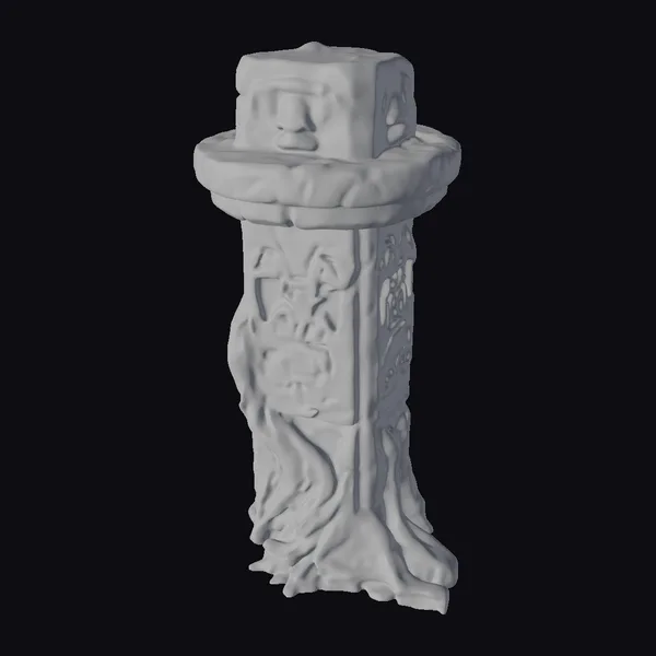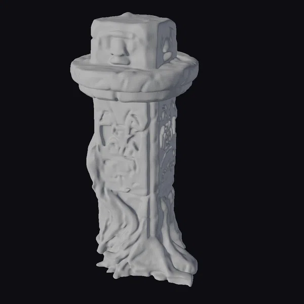 Standing tall with a sense of timelessness, the ancient stone totem pole showcases a detailed, moss-covered surface that wraps around its body, highlighting the textures of age and exposure. The base of the totem is dominated by carvings of tree roots that seem to twist and turn, as if trying to anchor the structure deeper into the earth. Above, the pole itself features a variety of symbols and patterns, etched into the stone with precision and care. A smaller, square stone caps the top, completing the mystical appearance. Ideal for use in games, 3D printing, VR/AR experiences, animation, and design projects seeking a touch of ancient mystery and a connection to nature.