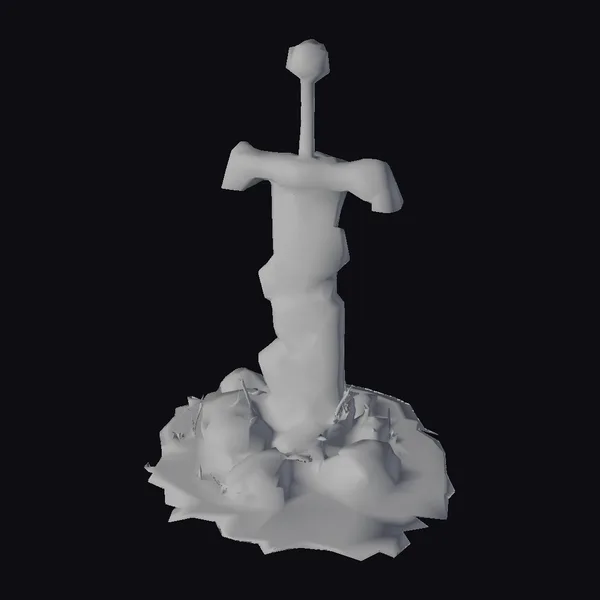 Perched atop a rugged stone pedestal, this ancient sword appears to have been lodged for centuries, its blade worn smooth by the elements. The hilt, crafted from a warm, earthy metal, seems to glow with an inner light, as if infused with a mystical energy. The surrounding green aura, complete with jagged rocks and wispy tendrils of moss, creates an otherworldly atmosphere, drawing the viewer into a realm of legend and wonder. Ideal for use in games, animation, or design projects, this 3D model is sure to add a touch of fantasy and adventure.