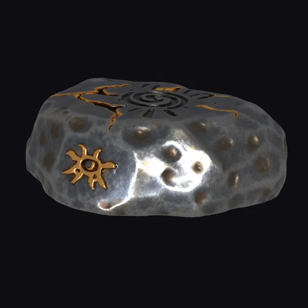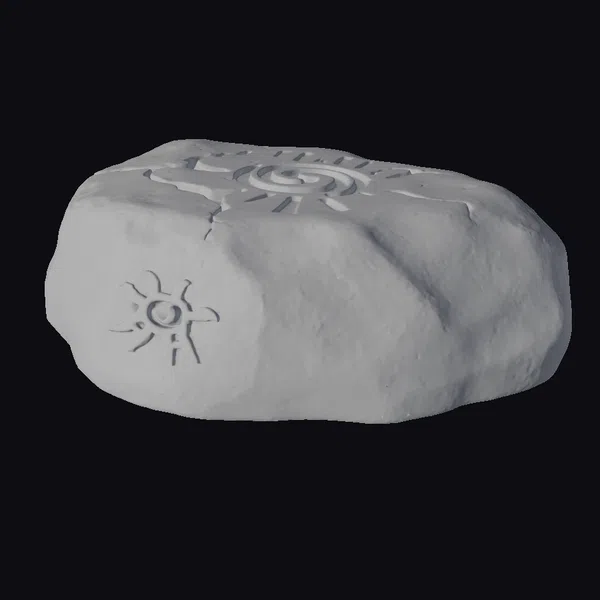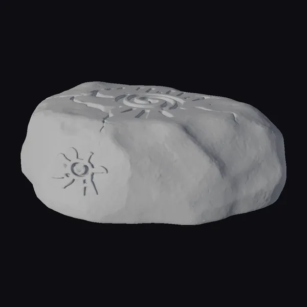 Perched atop a base of rough-hewn stone, the sunstone artifact presents a rugged, battle-hardened exterior, pockmarked with the scars of time. The surface is a masterful blend of dark grey and silver hues, evoking the subtle play of light on stone. Two golden sun symbols, one on the side and another on the top, seem to radiate an inner light, as if infused with the warmth of a thousand suns. The top surface features an etched spiral design, reminiscent of ancient mystic runes. As a 3D model, this artifact is primed for use in games, animations, or 3D printing, offering a wealth of creative possibilities. Designers and artists can integrate this mystical object into their projects, breathing life into fantastical worlds and narratives.