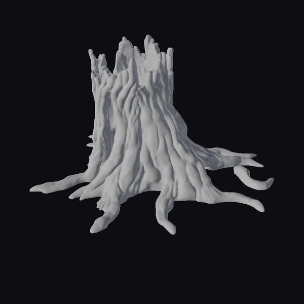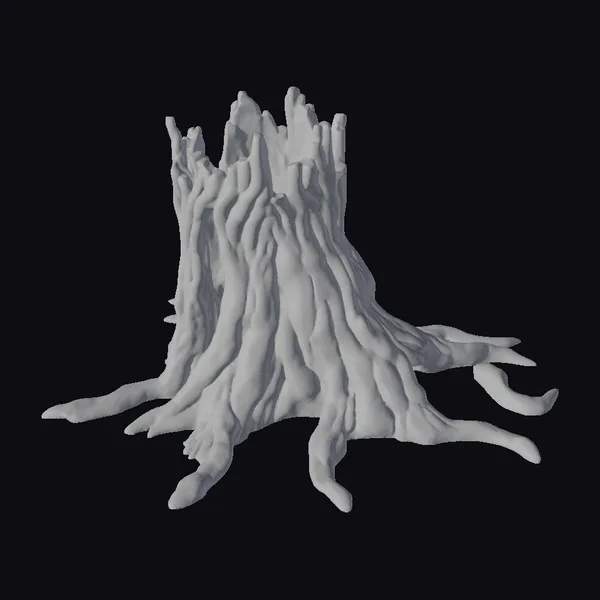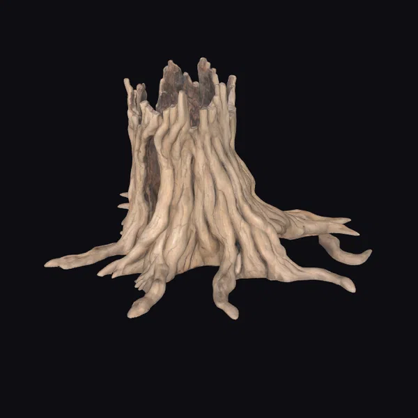 This intricately detailed tree stump showcases a complex network of roots and a hollowed trunk, with a broken top that appears to have been shattered by the forces of nature. The texture of the bark is deeply weathered, with a multitude of jagged cracks that add to the stump’s rugged charm. The pose of the stump, with its roots stretching out in various directions, suggests a sense of dynamic energy, as if the tree had been uprooted and left to decay. The model is rich in detail, from the rough, earthy texture of the bark to the subtle play of light on the wood’s surface. Ideal for use in games, 3D printing, VR/AR experiences, animation, and design projects where a realistic, aged tree stump is needed.