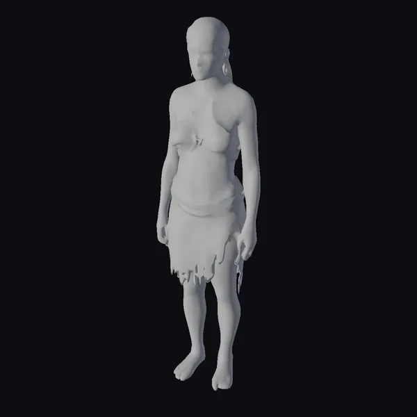 Rendered in exquisite detail, this Neolithic woman exudes a quiet confidence. Her facial features are finely chiseled, with a subtle, introspective gaze directed downward. The texture of her skin is richly rendered, with a warm, golden undertone that suggests a life spent under the sun. Her attire is a masterclass in primitive chic: a simple leather or animal hide skirt and top, wrapped and tied in a manner that speaks to a resourceful, practical sensibility. The frayed edges of her garments and the earthy tones of her outfit blend seamlessly with the natural hues of her skin, creating a harmonious visual experience. This model is perfect for projects requiring a historically accurate or evocative ancient character, such as games, animations, or historical reconstructions.
