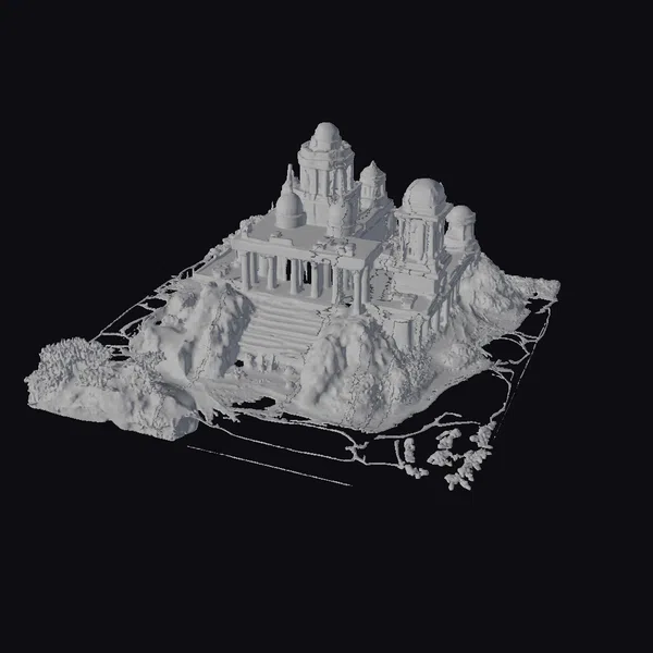Perched precariously on a rocky outcrop, the ancient temple appears to be in the final stages of being consumed by the ocean. The structure’s intricate design features multiple domed towers and a grand staircase, all of which are now weathered to a soft gray. The once-majestic building is now covered in vibrant coral and snaking tendrils of seaweed, with hints of orange and red adding a pop of color to the otherwise muted palette. The surrounding waters are a brilliant blue, with sunlight filtering through, casting an ethereal glow on the entire scene. This 3D model would be perfect for use in games, animations, or architectural visualizations looking to capture the essence of a lost city or an underwater adventure.