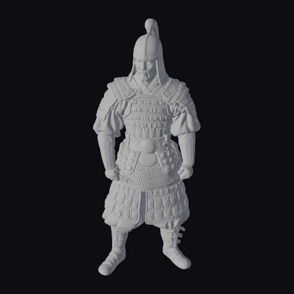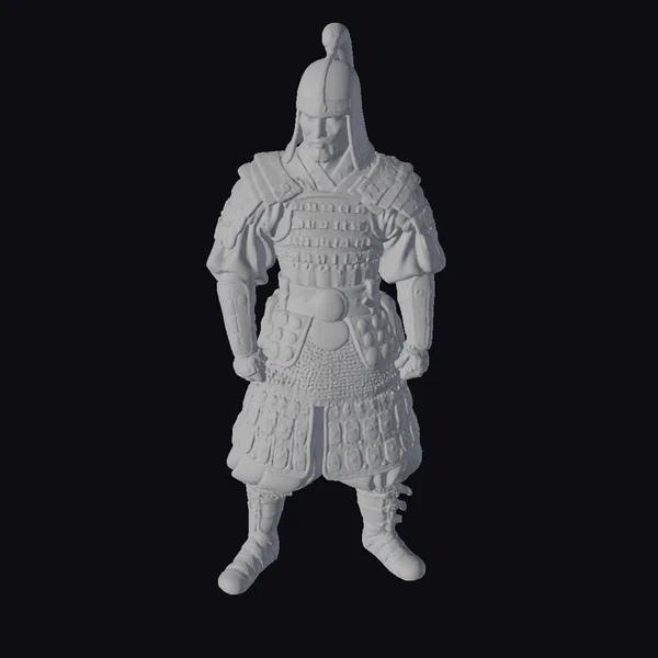 Detailed in every aspect, this ancient warrior model showcases a meticulously crafted armor set, complete with a helmet, shoulder guards, chest plate, arm guards, and leg armor. The armor’s metallic finish is interspersed with red and brown elements, suggesting a blend of functionality and ceremonial significance. The warrior’s stance, with hands on hips, conveys a sense of readiness and strength. The model’s high level of detail, from the texture of the armor to the expression on the warrior’s face, makes it highly suitable for use in historical reconstructions, fantasy settings, or as a reference for artists and designers. Its applications span across game development, animation projects, virtual reality experiences, and architectural visualization, where historical accuracy and detail are paramount.